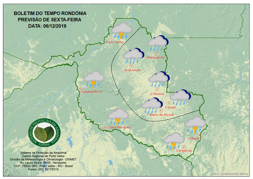 A Divisão de Meteorologia do Sistema de Proteção da Amazônia informa que a convergência de fluxo em baixos níveis da atmosfera aumenta a instabilidade em Rondônia nesta sexta-feira. A previsão é de um dia de céu nublado a encoberto, pouco sol e possibilidade chuva a qualquer hora do dia nas regiões do Vale do Jamari, central e da Zona da Mata rondoniense. Na Capital e nas demais regiões do Estado o sol aparece entre muitas nuvens e ocorrem pancadas de chuva com trovoadas entre a tarde e à noite.