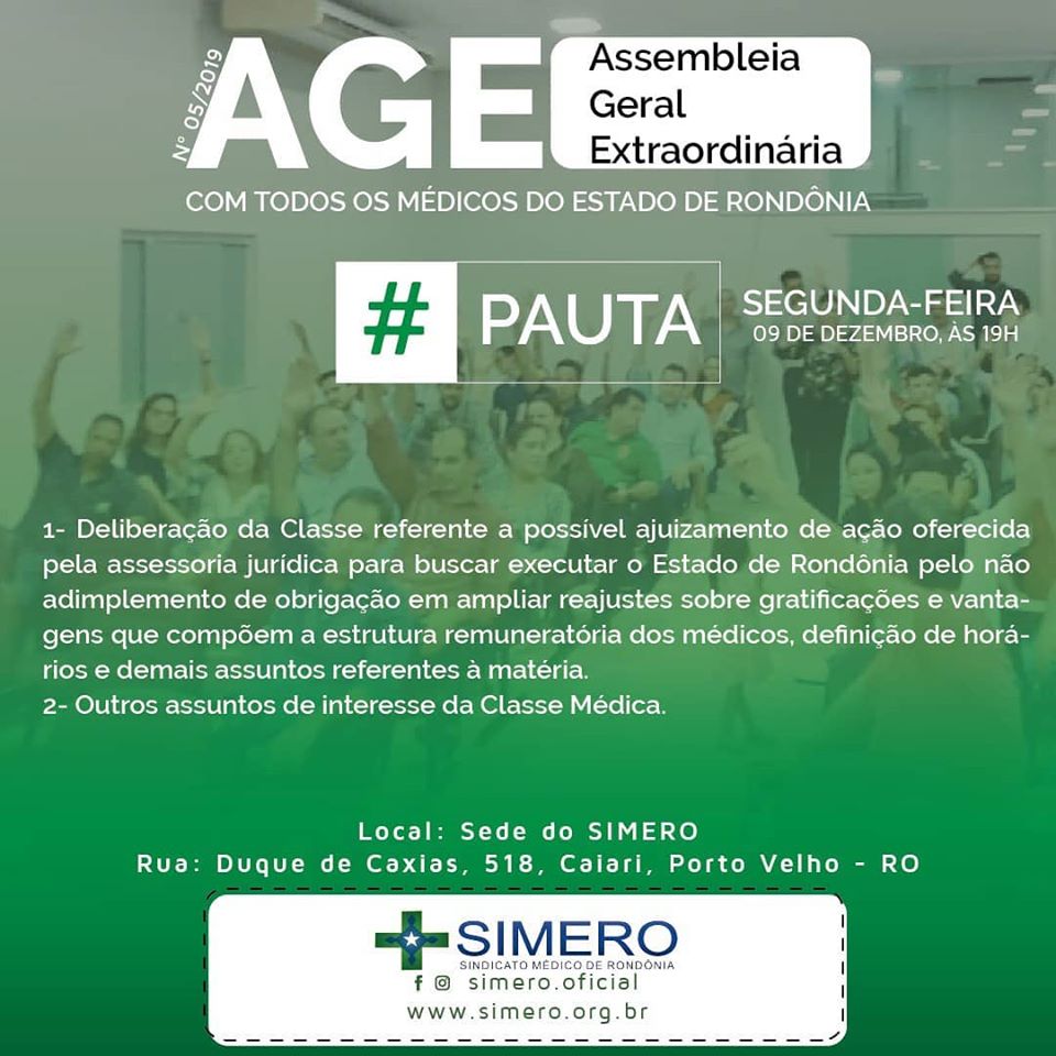 O Sindicato dos Médicos de Rondônia (SIMERO) realiza nesta segunda-feira a Assembleia Geral Extraordinária.