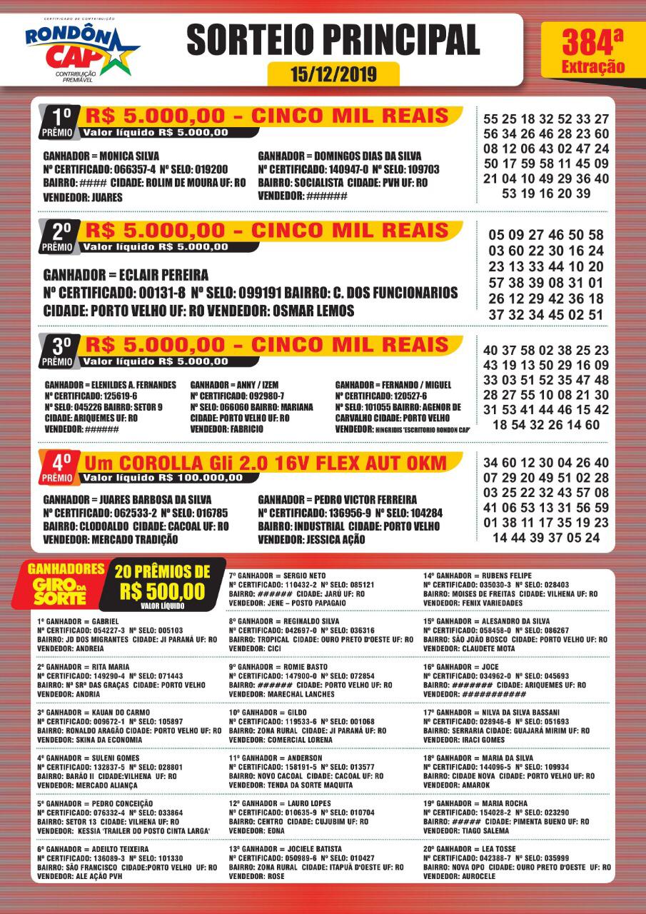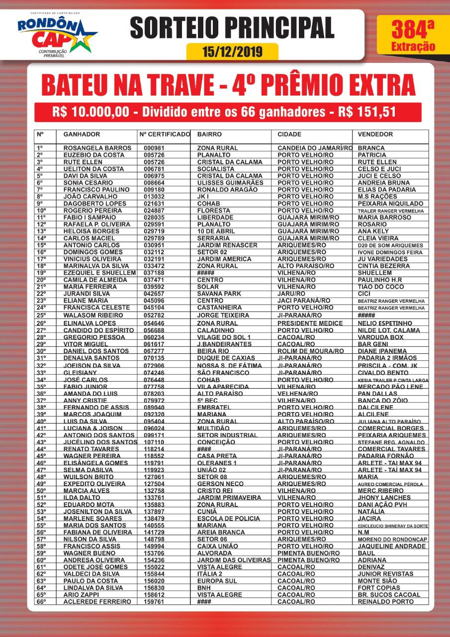 Os prêmios saíram para as cidades de Rolim de Moura, Porto Velho, Ariquemes, Cacoal, Ji Paraná, Vilhena, Jaru, Ouro Preto do Oeste, Cujubim, Itapuã do Oeste, Guajará Mirim, Pimenta Bueno, Candeias do Jamari, Alto Paraiso, Jaci Paraná e Presidente Medice.