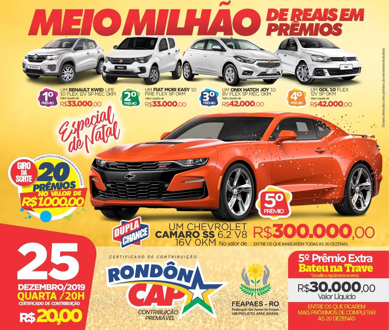 Quando você participa do sorteio do Rondoncap, você ajuda as Apaes de Rondônia através da FEAPAES/RO (Federação Estadual das Apaes de Rondônia) e concorre a muitos prêmios. No sorteio especial de natal, o Rondoncap vai sortear 04 carros e um Camaro no valor de R$ 300 mil reais. Será meio milhão de reais em prêmios.