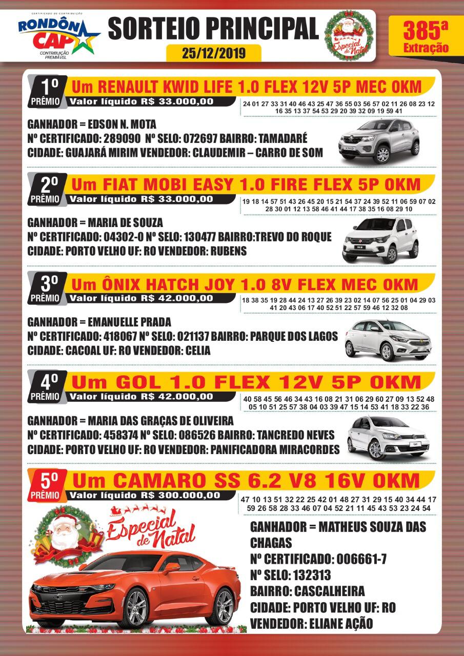 Os prêmios do sorteio especial de natal saíram para as cidades de Porto Velho, Guajará Mirim, Cacoal, Cerejeiras, Vilhena, Novo Paraiso, Colorado do Oeste, Candeias do Jamari, Ji Paraná e Ariquemes. O ganhador do Camaro foi o Matheus souza das chagas, morador da cidade de Porto Velho.