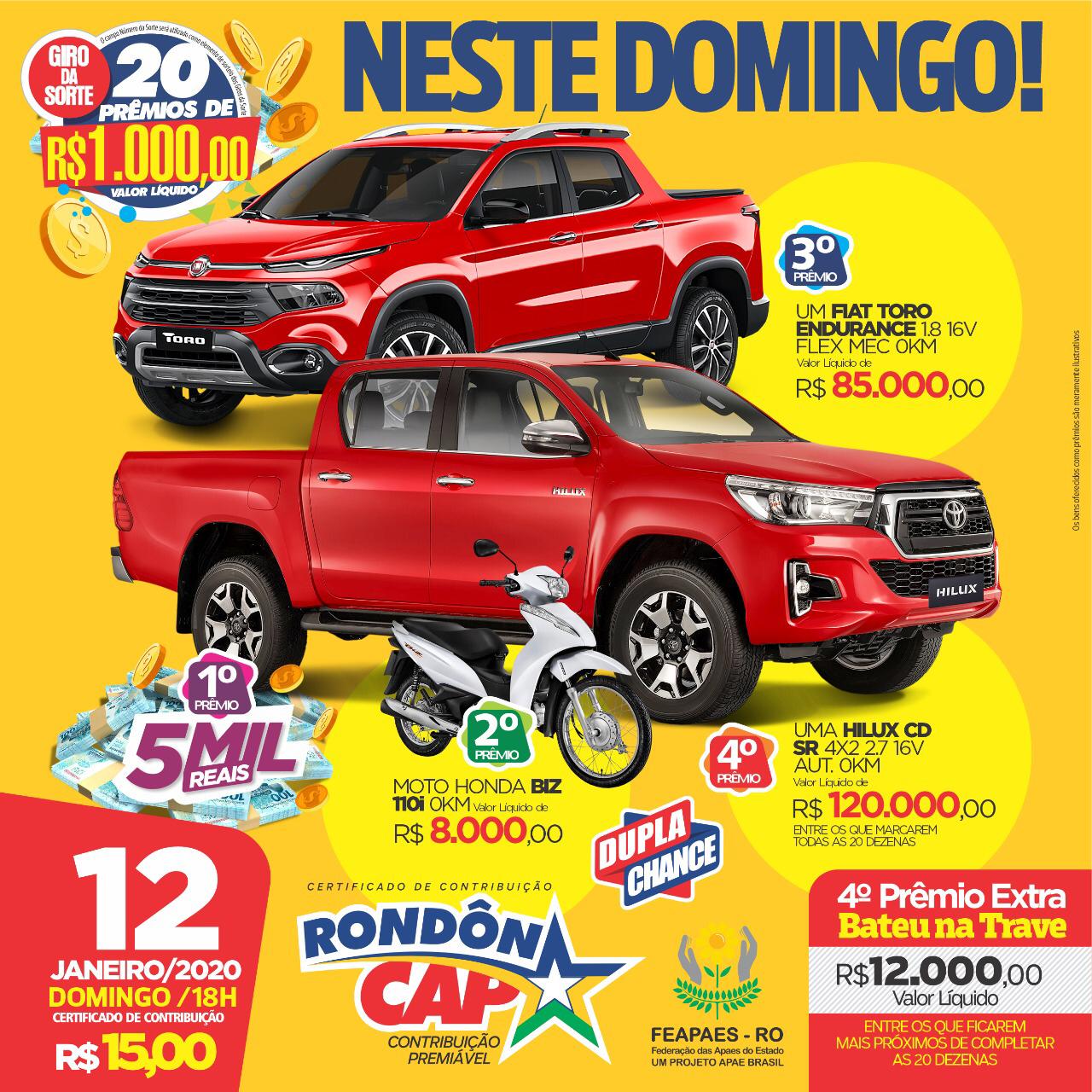 No próximo domingo será sorteado uma moto honda biz, duas caminhonetes: Uma Fiat Toro e uma Hilux, além de prêmios em dinheiro. Compartilhe amor, ajude a APAE que a sorte pode ajudar você.