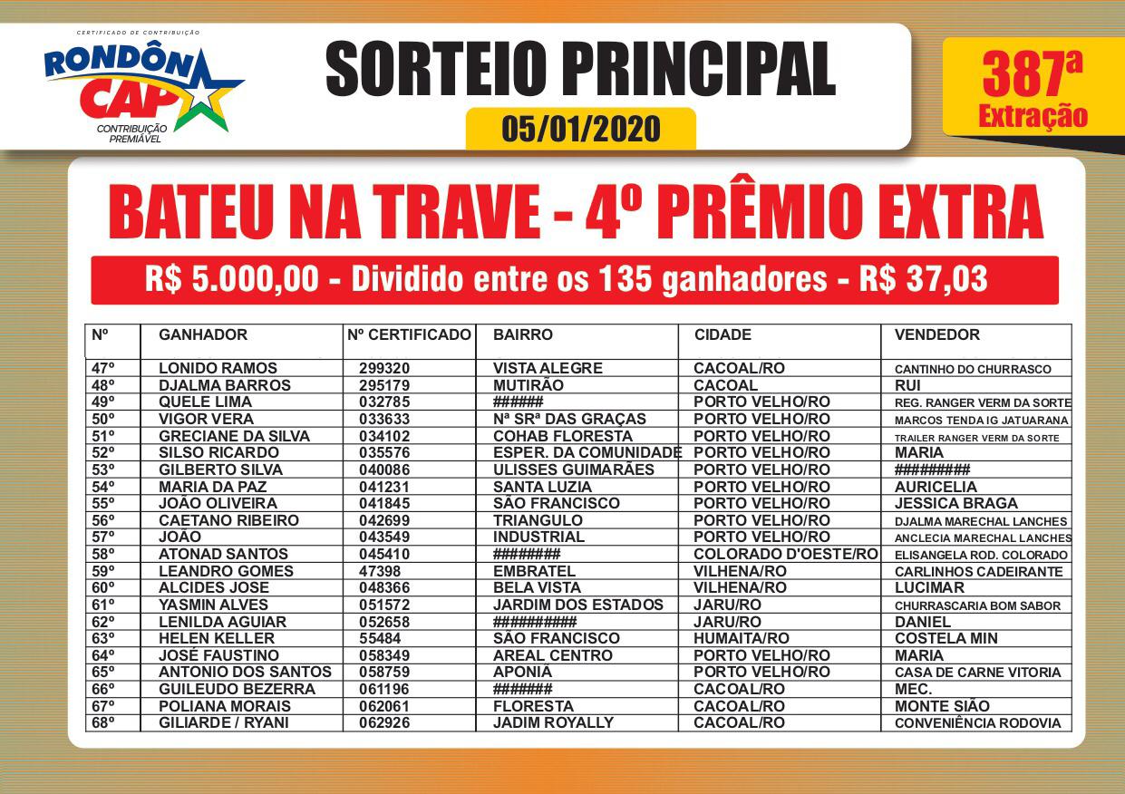Resultado do sorteio do prêmio “Bateu na Trave” ( Pessoas que ficaram por um número para ganhar o quarto prêmio). 135 pessoas ganharam o prêmio “Bateu na Trave”; ou seja: Ficaram por um número para ganhar o quarto prêmio; um Pick Up Strada no valor líquido de R$ 50 mil reais.