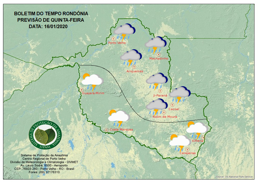 A Divisão de Meteorologia do Sistema de Proteção da Amazônia informa que nesta quinta-feira, o fluxo de umidade em altos níveis da atmosfera volta a favorecer a organização de muitas nuvens carregadas sobre grande parte do Sul da Amazônia, inclusive sobre Rondônia.