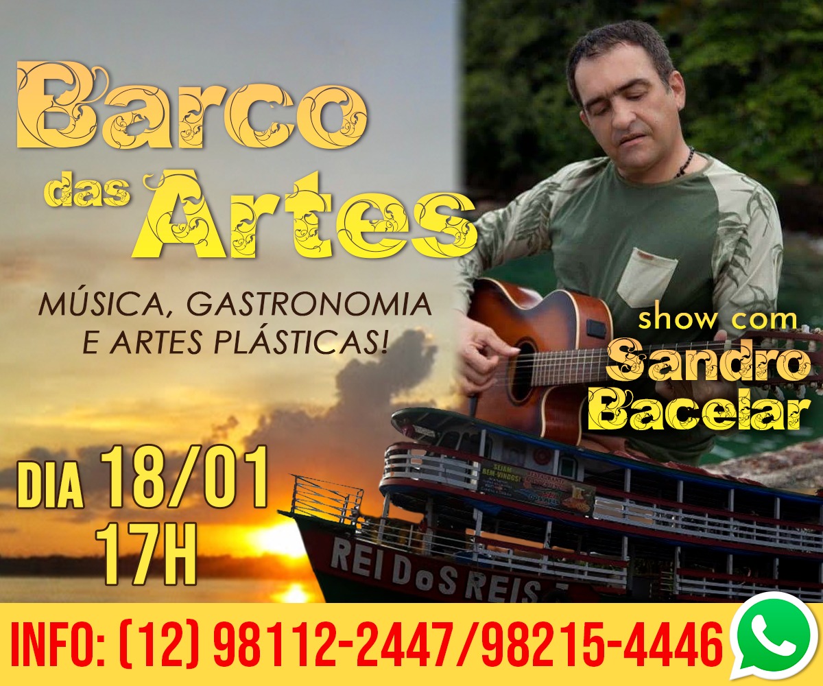 Neste sábado (18) a partir das 18h acontece a edição 2019 do Barco das Artes, que além do show exclusivo do cantor rondoniense Sandro Bacelar, terá exposição de telas produzidas pelo artista plástico Eliardo Lima.