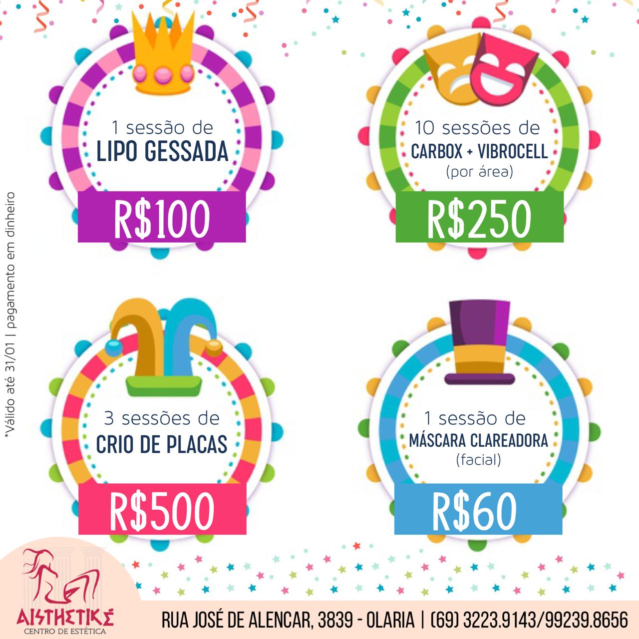 Nesse mês de janeiro, pensando no seu bem-estar e já entrando em clima de carnaval, os procedimentos mais procurados estão com promoção válida até 31/01 com valores super especiais para pagamento em dinheiro.