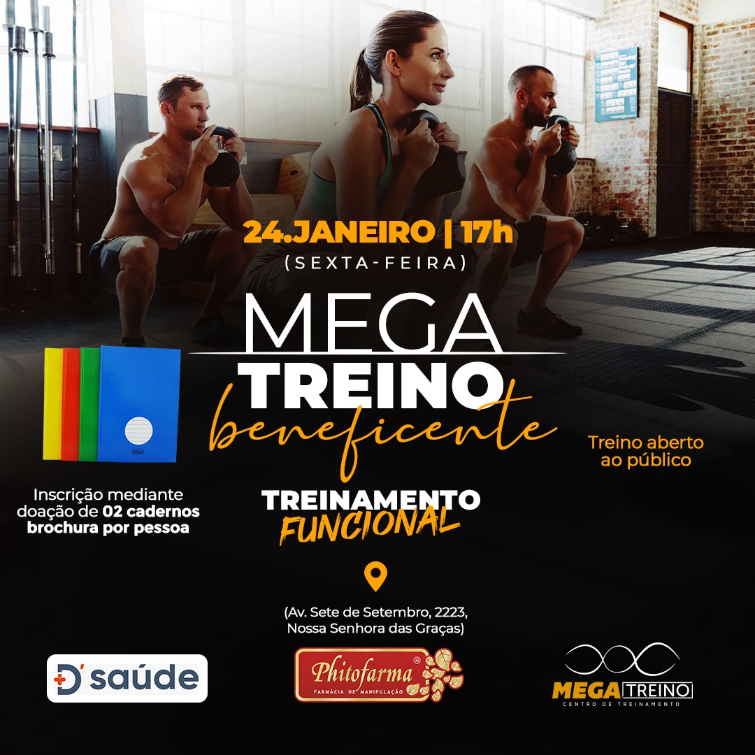 Nessa sexta-feira, dia 24, a partir de 17:00 acontece um Treino Beneficente promovido pela Mega Treino em parceria com a Phitofarma aberto ao público. As inscrições serão feitas mediante doação de 02 cadernos brochura por pessoa, em prol de arrecadações para serem distribuídos.