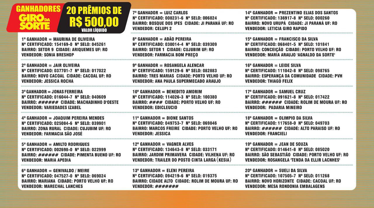 Quem ganhou o Fiat Argo sorteado no quarto prêmio foi a Geane Cristina da Cidade de Ariquemes, as motos sorteadas no primeiro, no segundo e terceiro prêmios saíram para as cidades de Ji Paraná, Candeias do Jamari, Pimenta Bueno, Jaru, Vilhena e Porto Velho, também tivemos os ganhadores dos Giros da sorte e quem ficou por um número para ganhar o Fiat Argo, ganhou o prêmio Bateu na Trave.