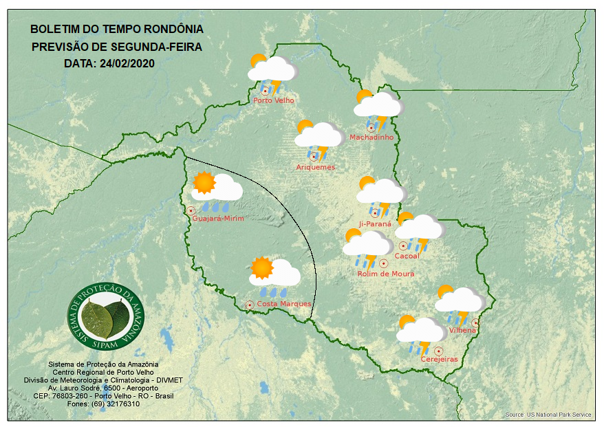 A Divisão de Meteorologia do Sistema de Proteção da Amazônia informa que o sol e o calor voltam a predominar sobre Rondônia neste começo de semana devido o enfraquecimento da friagem que chegou no último fim de semana ao Estado. A previsão é de céu claro a parcialmente nublado com possibilidade de chuva passageira e isolada à tarde apenas no Vale do Guaporé. Na Capital e demais regiões de Rondônia a segunda-feira será de céu parcialmente nublado a nublado com pancadas isoladas de chuva e trovoadas a partir da tarde.