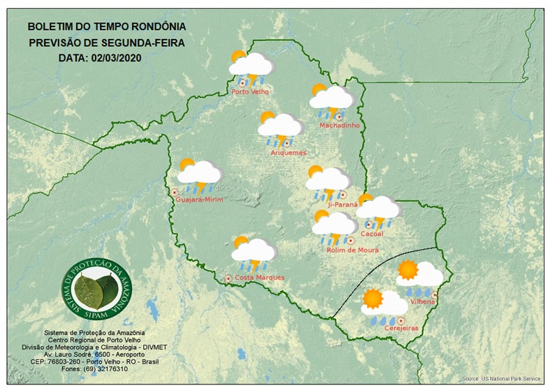 A Divisão de Meteorologia do Sistema de Proteção da Amazônia informa que nesta segunda-feira a instabilidade diminui um pouco em Rondônia com o enfraquecimento da Zona de Convergência de Umidade (ZCOU). Apesar do afastamento desse sistema do Sul da Amazônia, a umidade continuará alta na região. A previsão será de um dia de sol entre muitas nuvens em quase todo o Estado, inclusive na Capital Porto Velho, onde o tempo fica abafado e o mormaço favorece a organização de instabilidades no decorrer do dia. Por conta disso, entre a tarde e à noite estão previstas pancadas de chuva com trovoadas. Apenas no Sul do Estado o sol predomina na maior parte do dia, deixando o céu variando de claro a parcialmente nublado com possibilidade de chuva em áreas isoladas entre a tarde e noite.