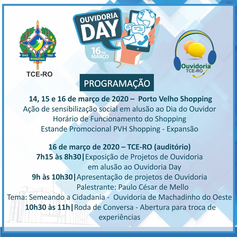 A Ouvidoria do Tribunal de Contas de Rondônia (TCE-RO), com apoio de outras unidades setoriais da instituição, vai realizar o “Ouvidoria Day”, que terá ações no Shopping Porto Velho, nos dias 14 (sábado), 15 (domingo) e 16 (segunda-feira que vem), e um evento no dia 16, no auditório da Corte.