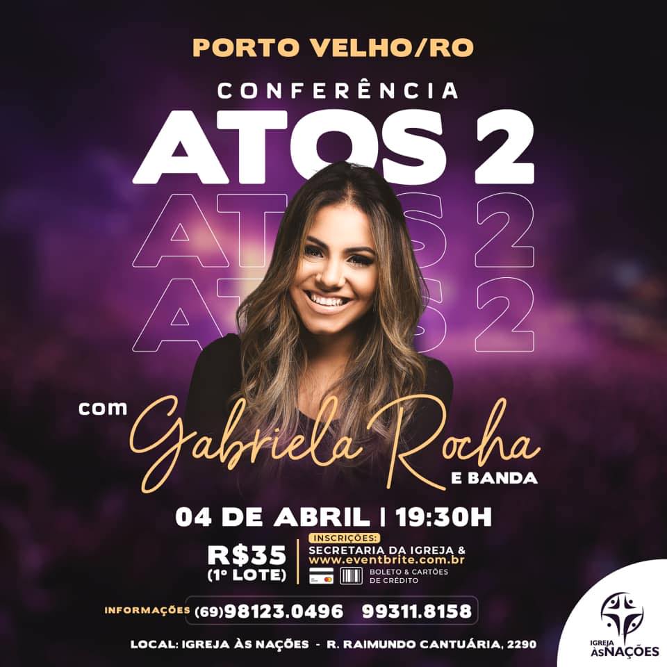 Vem aí! Pela primeira vez em Porto Velho, a cantora gospel Gabriela Rocha e banda, trazendo louvores como “Lugar Secreto”, “Nada Além De Ti” em uma noite inesquecível de adoração na Conferência Atos 2, dia 04 de abril a partir das 19:30 na Igreja Às Nações.