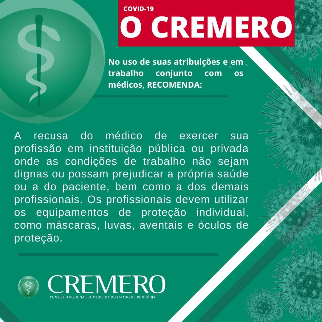 O Conselho Regional de Medicina do Estado de Rondônia (Cremero) divulgou nota alertando sobre a necessidade de os médicos usarem equipamentos de segurança durante a realização de trabalhos da categoria.