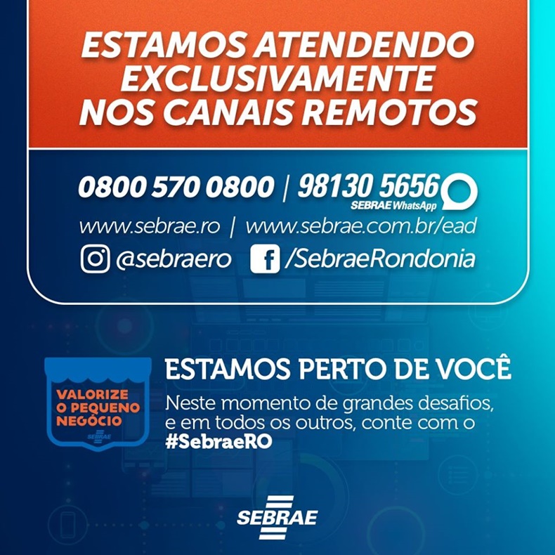 Não deixe de buscar orientações sobre como reagir diante deste cenário de pandemia. O Sebrae em Rondônia pode atendê-lo também remotamente. Acesse nosso portal de atendimento em www.sebrae.ro. Ligue para nossa Central de Relacionamento 0800 570 0800, envie mensagens por Whatsapp (69) 98130-5656, acesse nosso portal de ensino à distância www.sebrae.com.br/cursosonline ou nos siga em nossas redes sociais (@sebraero).