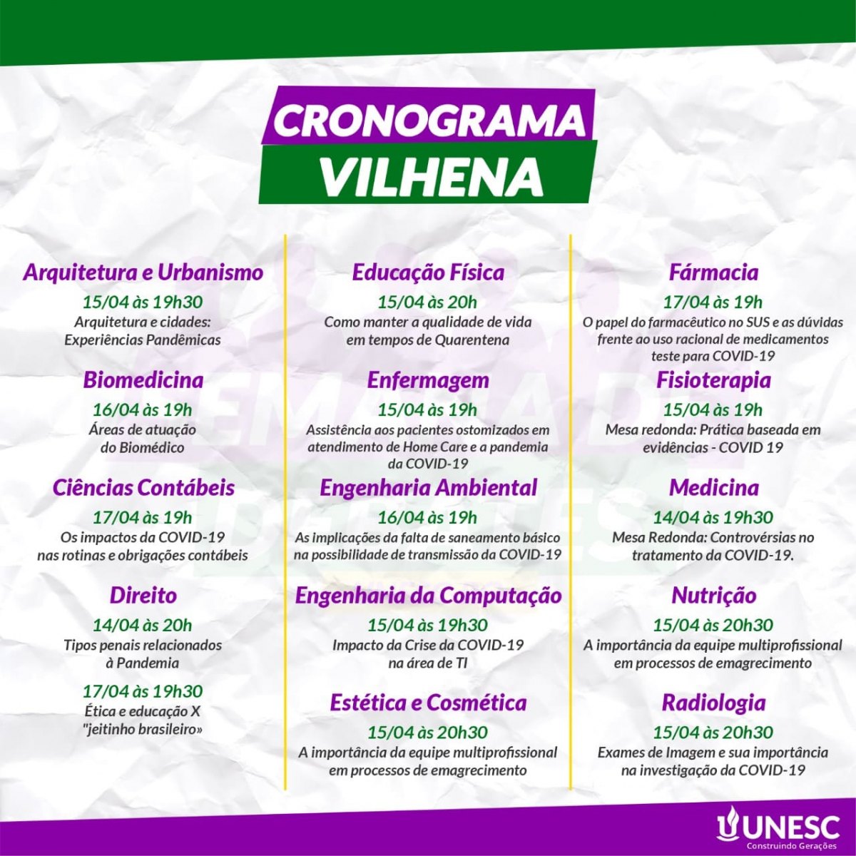 O diretor executivo da Unesc citou como exemplo áreas como a Pedagogia, onde os usos das tecnologias estão sendo essenciais neste momento de isolamento social. “A educação toda está acontecendo através do uso das tecnologias remotas e muitos profissionais não tem essa habilidade. Então a idéia é despertar, através do debate, como olhar essas tecnologias a partir de agora! O que muda no perfil do pedagogo, a partir desta crise. Já na Psicologia, o debate será voltado à saúde mental da população, sobre a importância do enfrentamento dos indivíduos a essa pandemia. O nutricionista vai se dirigir a importância da alimentação neste período de isolamento, a necessidade de despertar uma consciência sobre isso”, ressaltou.