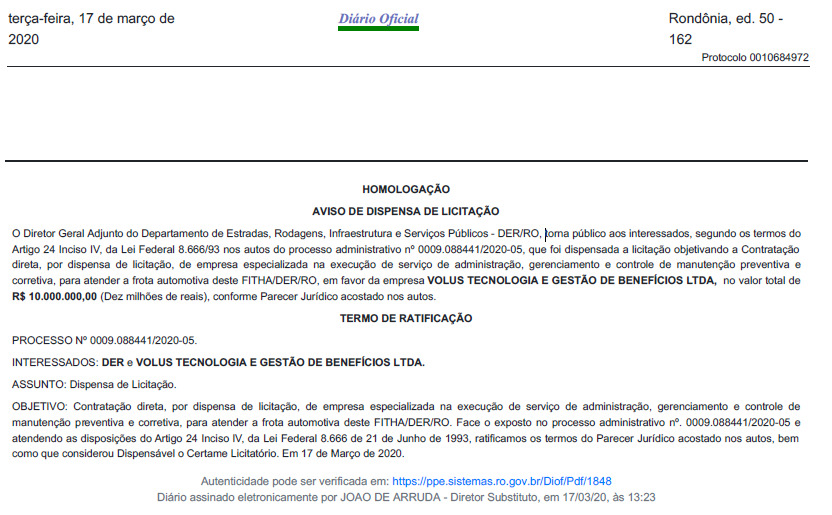 Conforme publicação do portal OObservador, abro aspas, "O DER firmou contrato no valor de R$ 10 milhões de reais do FITHA - Fundo de Infraestrutura de Transporte e Habitação), recursos de arrecadação própria destinados para atender recuperação de estradas estaduais, fazendo uso da dispensa de licitação com pelo artigo 24 inciso IV da Lei de Licitação (Lei n. 8666/93). O inciso traz a hipótese permissiva em caso de emergência ou de calamidade o que revela, o DER faz uso do decreto da COVID19 para firmamento do contrato. Reputamos "fraude e ao mesmo tempo direcionamento".