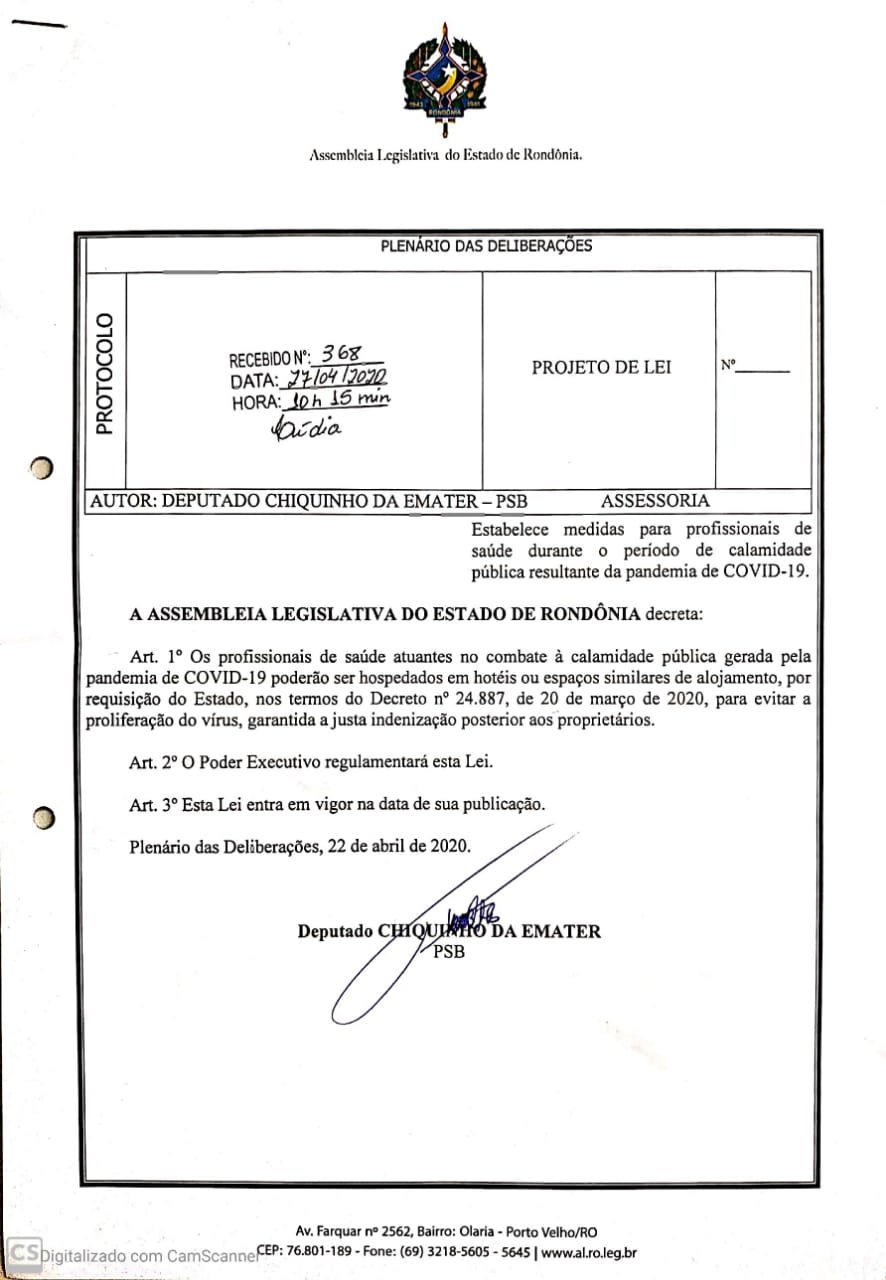 A pedido da Presidente do Sindicato dos Trabalhadores em Saúde no Estado de Rondônia (SINDSAÚDE), Célia Campos, o deputado estadual Chiquinho da Emater encaminhou ao Governo do Estado a indicação de implantação da insalubridade grau máximo (40%) aos profissionais da saúde, devido ao período crítico da pandemia causada pelo novo coronavírus.