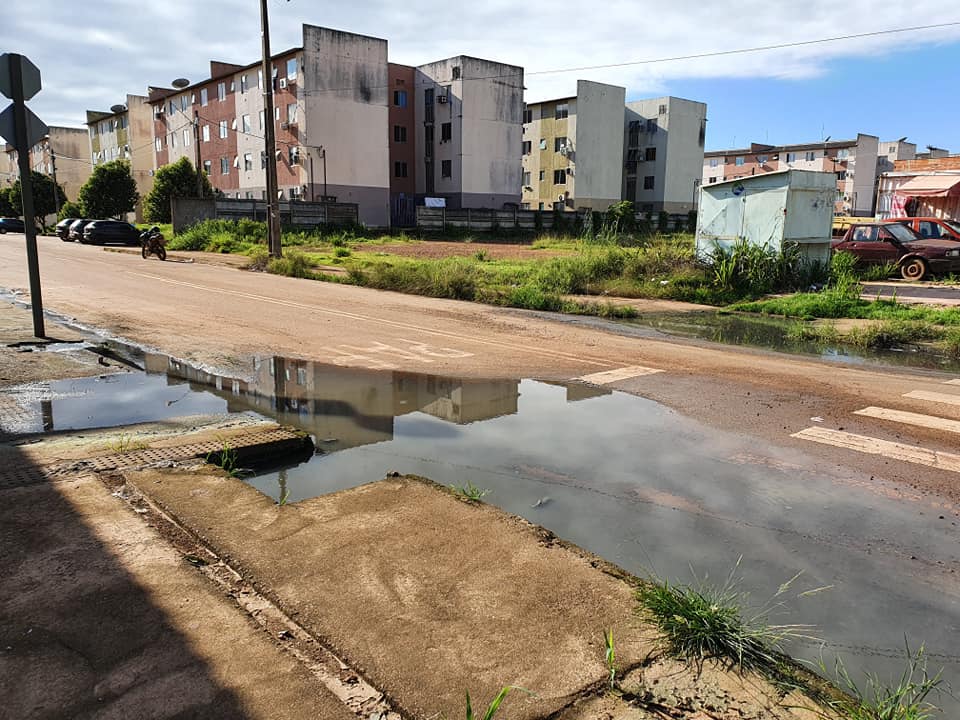 O esgoto está estourado e a água pútrida fica empoçada na área, levando mau cheiro, além do risco de contaminação