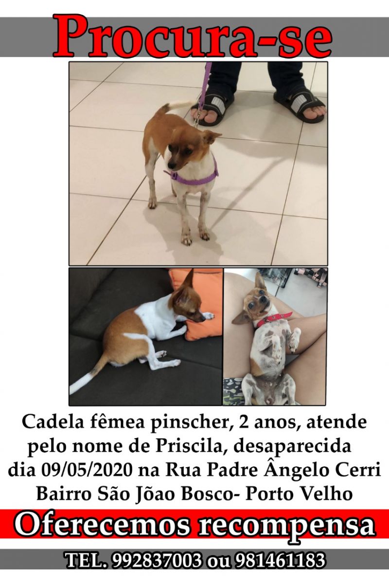 Família pede ajuda para encontrar cachorrinha da raça Pinscher, tem apenas 2 anos e atende por nome "Priscila" que desapareceu no dia 09/05/2020 nas mediações da Rua Padre Ângelo Cerri no Bairro São João Bosco em Porto Velho.