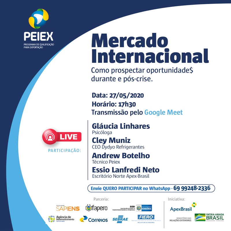 O evento tem como tema “Mercado Internacional: como prospectar oportunidade$ durante e pós-crise” e será realizado por meio da plataforma Google Meet às 17h30 do dia 27 de maio. Os interessados devem se inscrever por meio do seguinte formulário: