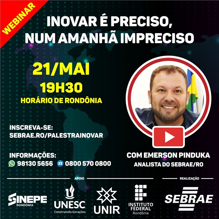 Logo depois anunciou que o colaborador do Sebrae, analista Emerson Pinduka realizará a live Inovar é Preciso Num Amanhã Impreciso, que graças às parcerias com a Unir, Ifro, Unesc, Sinepe e demais interessados, está na expectativa de público em milhares de participantes. Imediatamente Eugênio da Ciclo Cairu perguntou o horário, porque gosta das palestras do Pinduka e Daniel confirmou 19h30 desta quinta-feira (21).