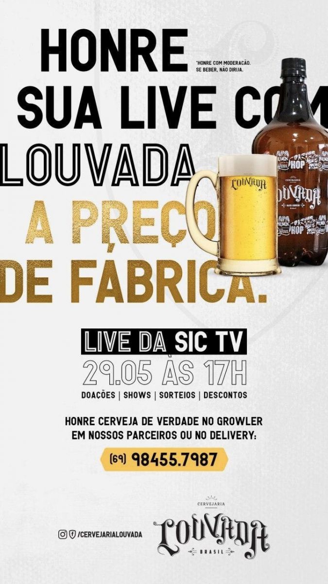 A palavra de ordem é solidariedade. E a Louvada, como sempre, honra as boas ações que beneficiam a sociedade. A cervejaria será a patrocinadora oficial da ‘Live Solidária SIC TV’, marcada para o próximo dia 29 de maio, às 17h (local), com transmissão pela SIC TV, Rádio Parecis FM e redes sociais da SIC, além do Facebook da Louvada.