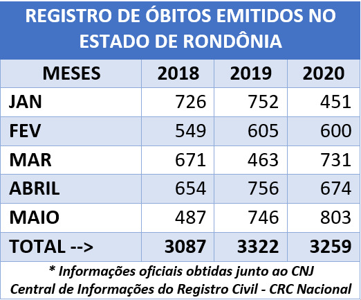 Até esta quarta-feira, 3 de junho, os óbitos registrados no Estado de Rondônia, este ano, são 1,89% menor na comparação com 2019, totalizando 63 mortes a menos. Frente a 2018, nota-se um crescimento de 5,27%, o que corresponde a 172 óbitos.