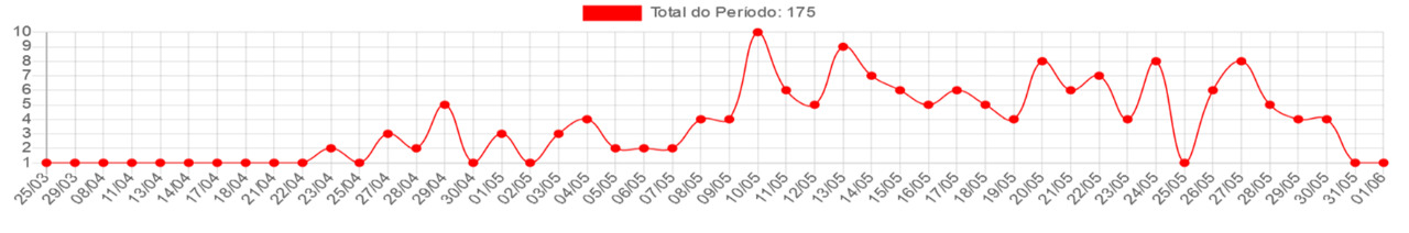 Em relação aos óbitos relacionados a COVID-19, o maior pico de incidência de mortes pela doença foi registrado em 11 de maio, quando 10 pessoas morreram.