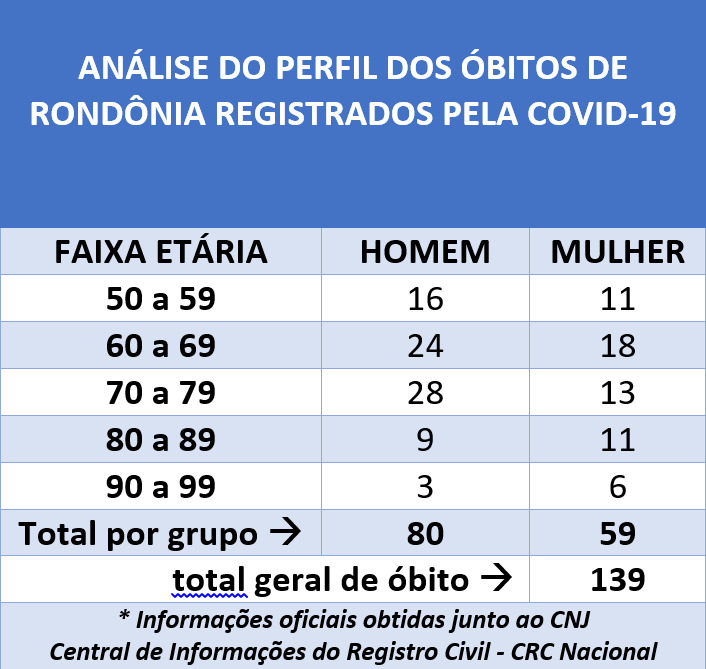 Os dados ainda revelam que 79,42% das vítimas fatais de covid-19 eram pessoas com 50 anos ou mais. Do total de 139 mortes, 79,42% são pessoas com 50 anos ou mais e, 26,25% eram do sexo masculino.