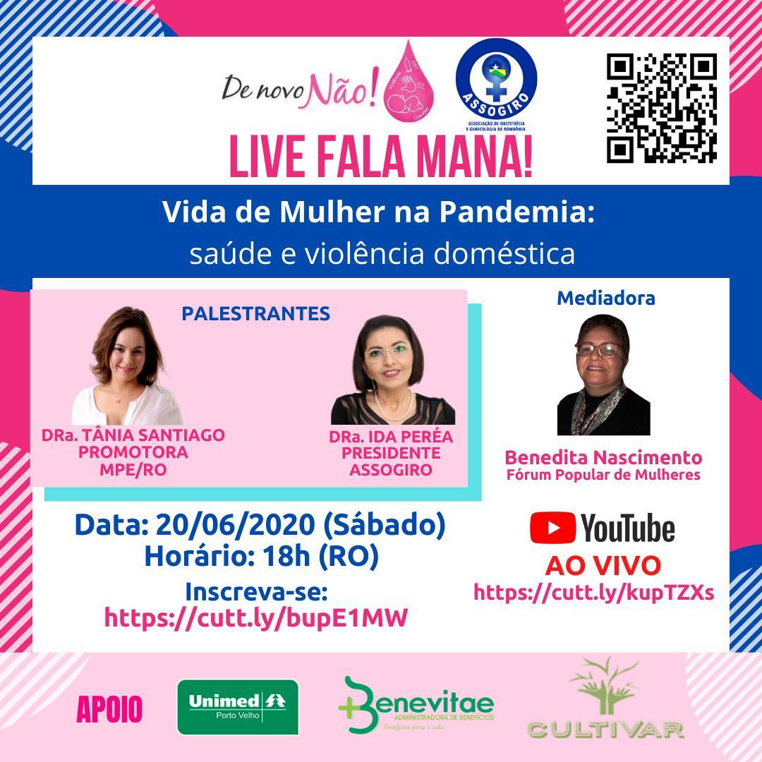 A Assogiro (Associação de Obstetrícia e Ginecologia de Rondônia) em parceria com o projeto ‘De Novo Não’ vai transmitir neste sábado, 20, a live ‘Fala Mana’ através do Canal De Novo Não no YouTube, às 18h.