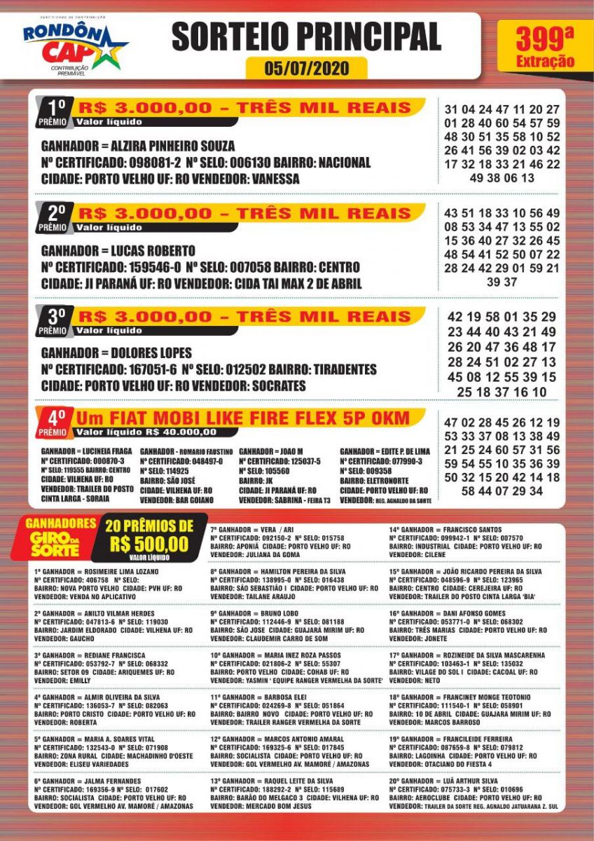 Resultado do Sorteio do Rondoncap - Prêmios principais e giros da sorte: