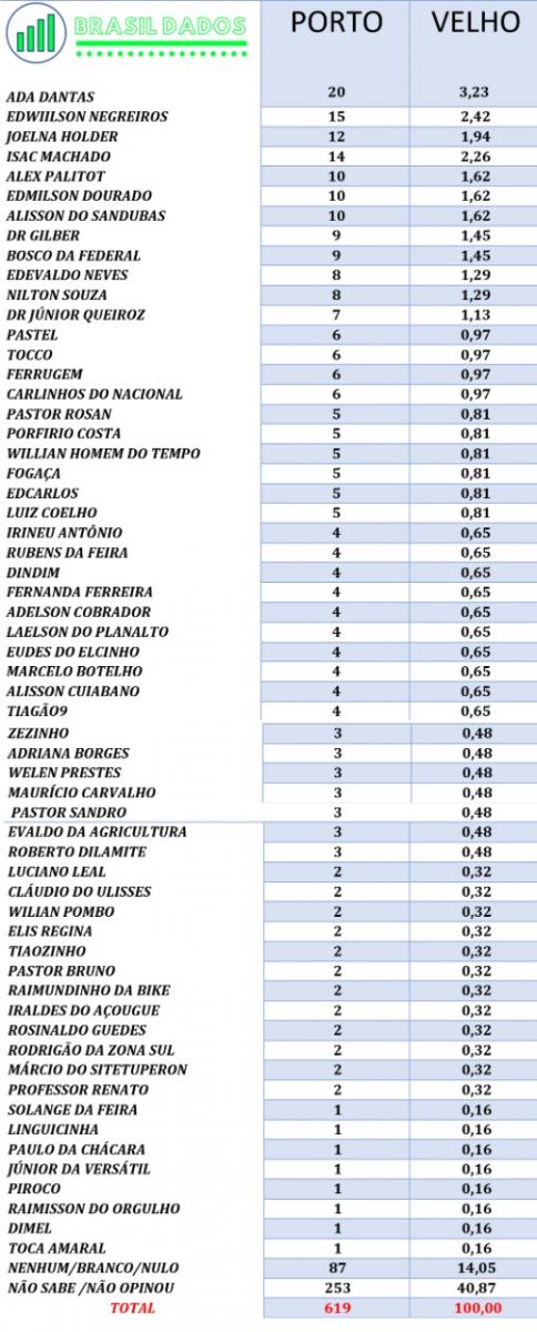 O Instituto Dados Brasil divulgou nesta quinta-feira, a primeira pesquisa espontânea para pré-candidatos a vereador em Porto Velho. A lista é composta por 55 nomes escolhidos espontaneamente pelos eleitores. A maioria, são de pré-candidatos ainda iniciantes, ou que ainda possuem pouco tempo de militância na política, ou estão se candidatando pela primeira vez.