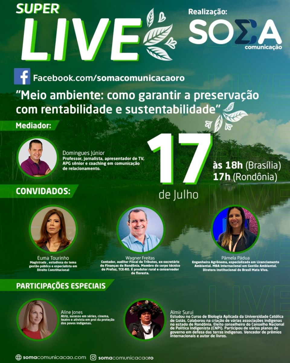 Com um tema em pauta na agenda política internacional, a Live terá como moderador o professor, jornalista e apresentador de TV Domingues Júnior. “Pouca gente sabe, inclusive aqui mesmo no estado de Rondônia, que a cidade de Guajará-Mirim é o município que tem a maior quantidade de preservação de floresta do mundo, chegando à incrível marca de 97%. Mesmo assim, a cidade vive uma terrível realidade de crise econômica. Nós temos que mudar essa situação. Dá para gerar riquezas, preservando a natureza”, ressalta Domingues.