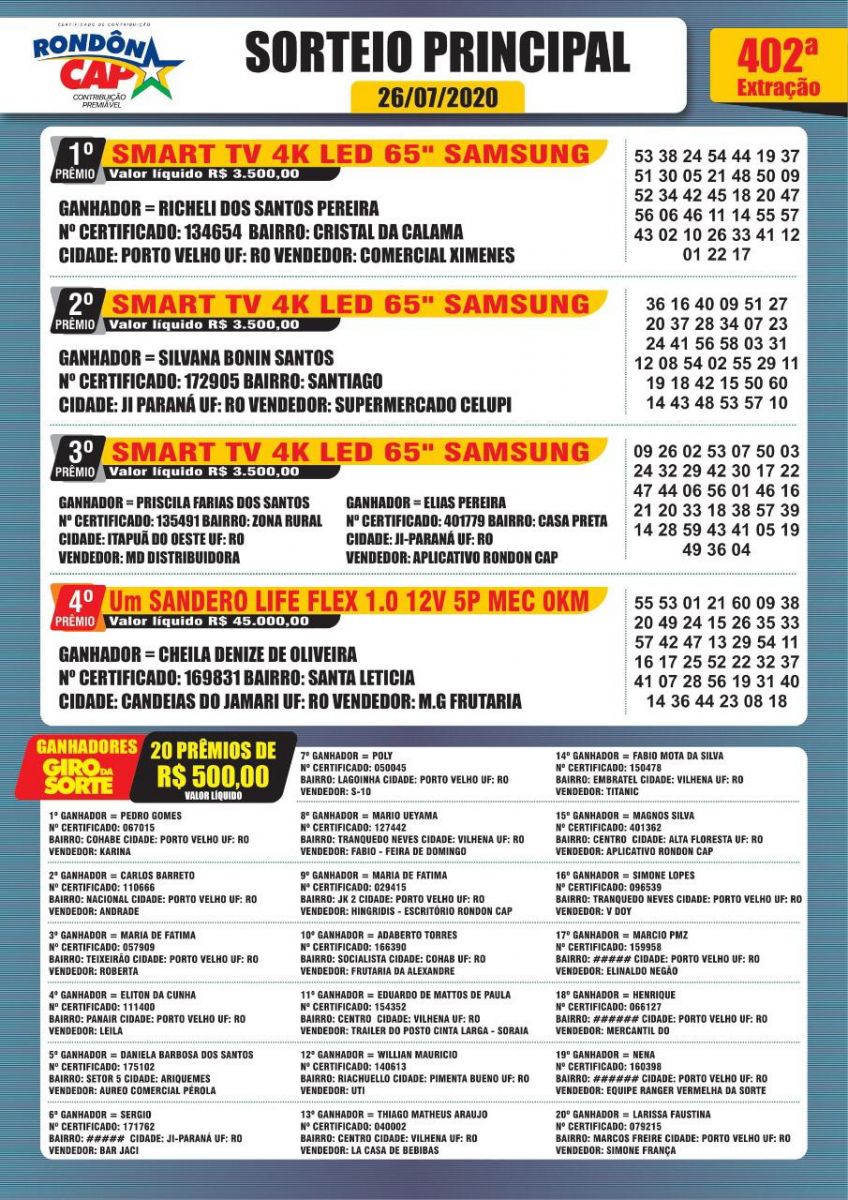 Resultado do Sorteio do Rondoncap - Prêmios principais e giros da sorte: