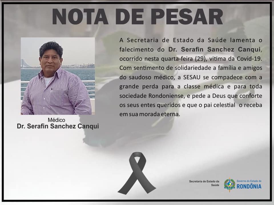 Faleceu nesta quarta-feira (29), o médico anestesista Serafin Sanchez Canqui, que prestava serviço na rede pública de Saúde do estado de Rondônia, ele foi vítima de complicações em decorrência de infecção por COVID-19.