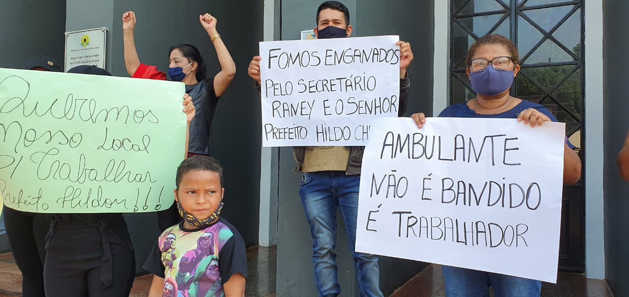 Na manhã desta segunda-feira (17) um grupo trabalhadores informais que foram retirados da praça Jhonatas Pedroza, realizaram uma manifestação em frente a prefeitura de Porto Velho para exigir que o prefeito Hildon Chaves (PSDB) cumpra a promessa feita a eles de que conseguiria um novo local.