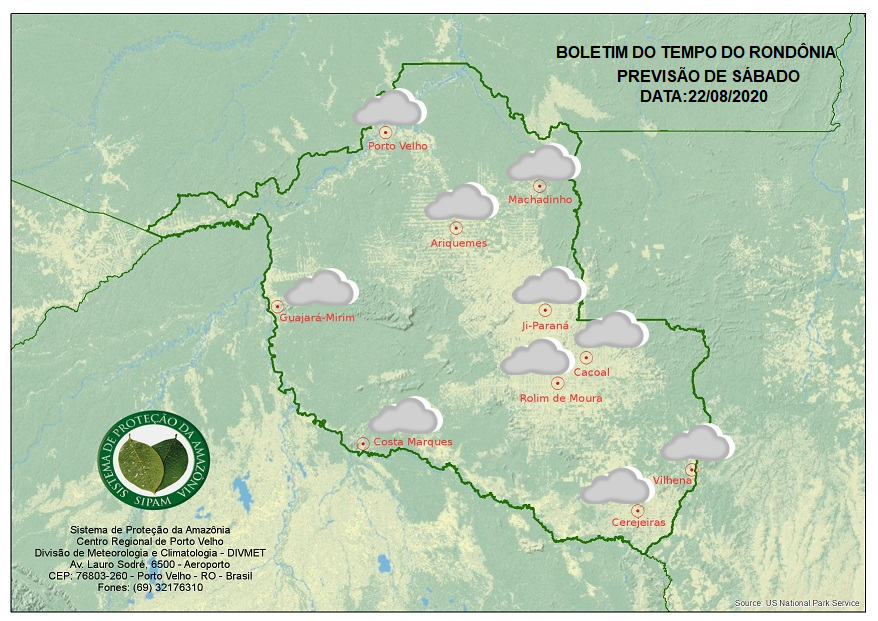A Divisão de Meteorologia do Sistema de Proteção da Amazônia informa que com a friagem estabelecida em toda a região o sábado (22) será de tempo variando de nublado a parcialmente nublado. Apesar das nuvens não há previsão de chuvas em todo o estado. O dia será ventilado e com temperaturas baixas.