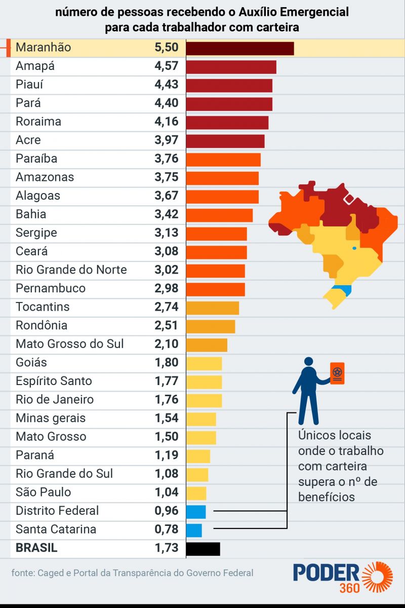 A média nacional é de para cada empregado com carteira assinada no país, exista 1,73 beneficiário do auxílio emergencial. O Brasil, tem hoje 65,4 milhões de pessoas recebendo o auxílio para 37,7 milhões de empregos. As pessoas recebendo o auxílio já correspondem a 68% dos 96,1 milhões da força de trabalho (soma de empregados com desocupados).