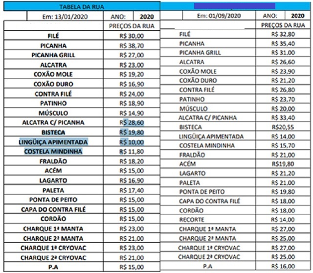 Confira a tabela comparativa dos preços dos cortes de carnes entre o mês de janeiro e outubro de 2020, lembrando que esses valores são correspondentes ao que sai da distribuidora, sendo que aumenta ainda mais nos mercados e açougues.
