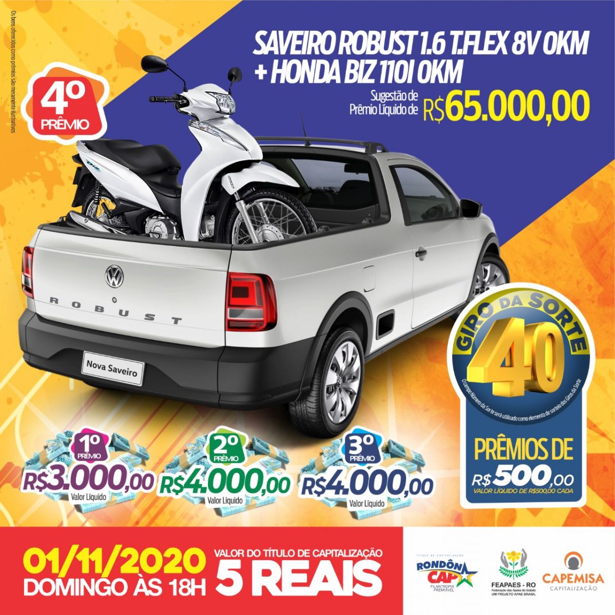 O Rondôncap premiou muita gente em outubro e em novembro vai premiar muito mais pra quem contribui com as Apaes de Rondônia, e pra começar novembro com pé direito tal ganhar um saveiro com uma biz na carroceria com apenas 5 reais?