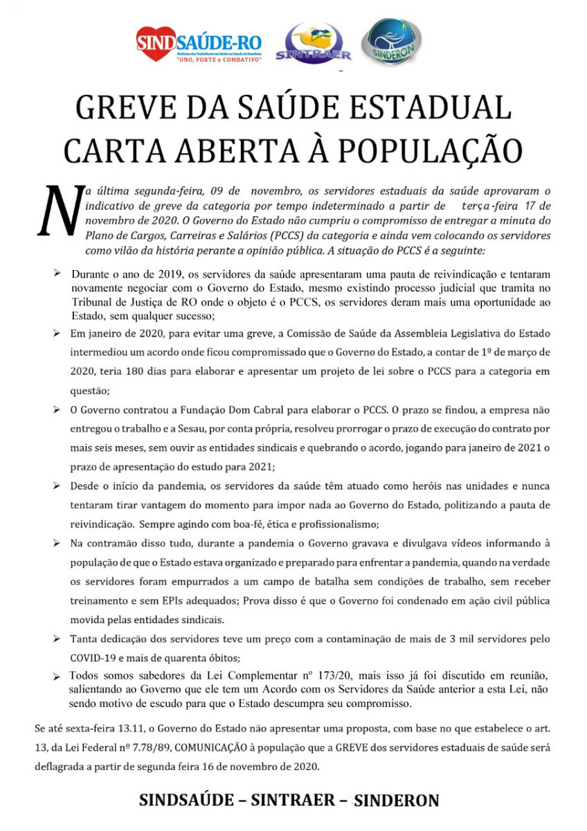 Na última segunda-feira, 09, os servidores estaduais da saúde aprovaram o indicativo de greve da categoria por tempo indeterminado a partir da próxima segunda-feira, 16 de novembro de 2020.