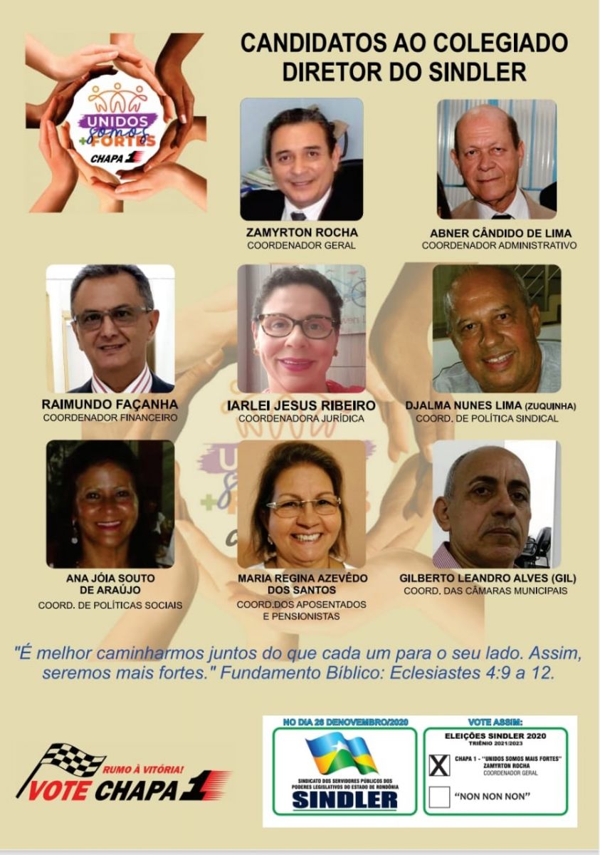 São duas as chapas que concorrem ao pleito, cada uma com 37 integrantes. O Coordenador Geral que encabeça a Chapa 1 (Unidos Somos Mais Fortes), é o sindicalista Zamyrton Rocha, servidor da Casa Legislativa há mais de 37 anos, Jornalista, Escritor, Palestrante, Bacharel em Direito, com vasta bagagem de conhecimento sindical e experiência marcante em mais de oito anos atuando na Primeira Secretaria da da ALE-RO.