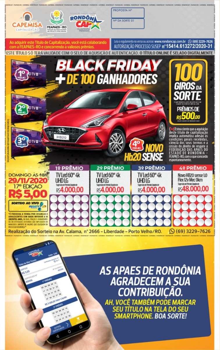 Black Friday Rondoncap, você pode ter um HB20 zero KM na sua garagem ou 48 mil reais no bolso e mais uma TV 60” no terceiro prêmio outra TV 60” no segundo e no primeiro prêmio.