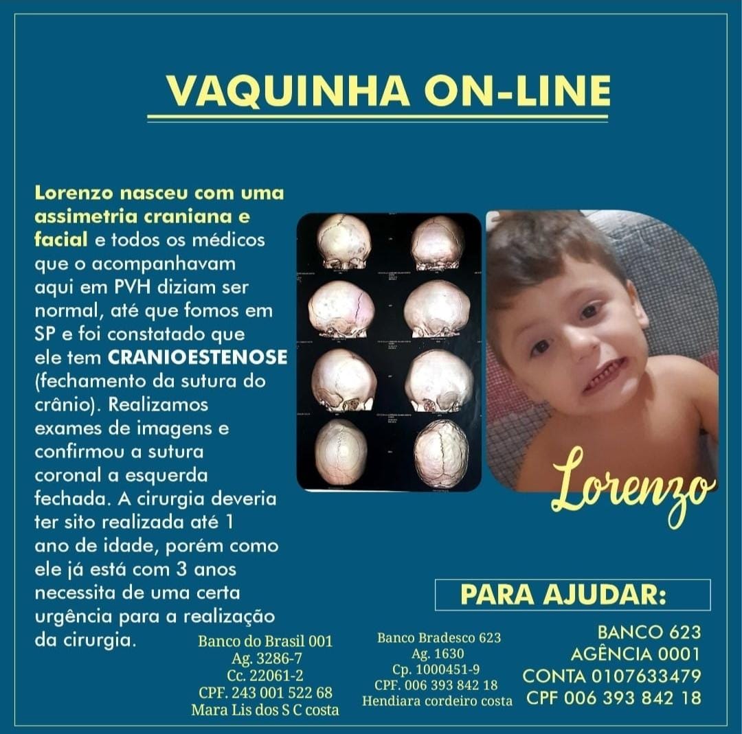 Como a situação se agravou, a família foi consultar em uma clínica especializada em São Paulo e descobriu que Lorenzo teve fechamento precoce da sutura esquerda. A caixa craniana se fechou antes do tempo normal de crescimento. O problema só pode ser resolvido através de cirurgia que custa cerca de R$ 198 mil.