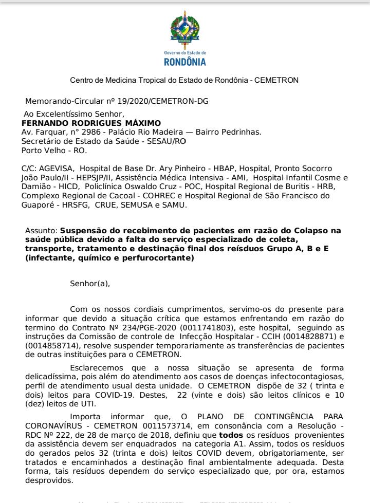 Um Memorando Circular emitido pela direção do Centro de Medicina Tropical de Rondônia – CEMETRON, anunciou a suspensão das transferências de pacientes para a unidade hospitalar em decorrência da inexistência do serviço de coleta de lixo na unidade hospitalar.