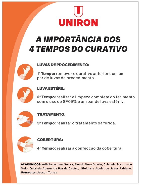 Os acadêmicos do 9º período Adielly Souza, Blendo Nery, Cristieli Socorro de Melo, Gabriela Castro e Gleiciane Aguiar, orientados pelo Professor Jacson Sabino, realizaram um trabalho no Hospital Prontocordis a respeito dos 4 tempos do curativo (remover o curativo anterior/realizar a limpeza/tratar a ferida/fazer a cobertura da ferida), cujo objetivo foi de dar eficácia e assepsia para reduzir o número de infecções na realização dos curativos no ambiente hospitalar. A idéia surgiu através de visitas in loco realizadas pelos discentes acima, onde observaram a necessidade desta melhoria.