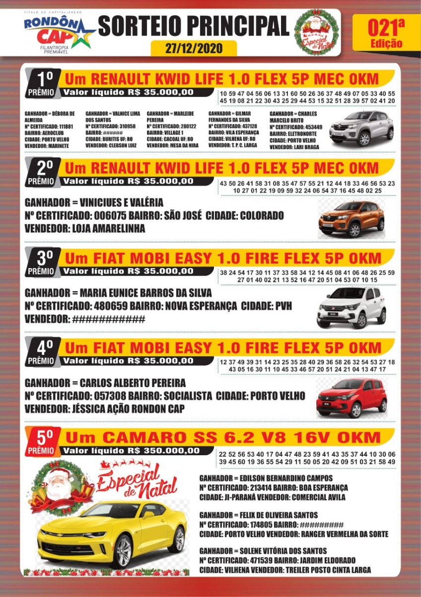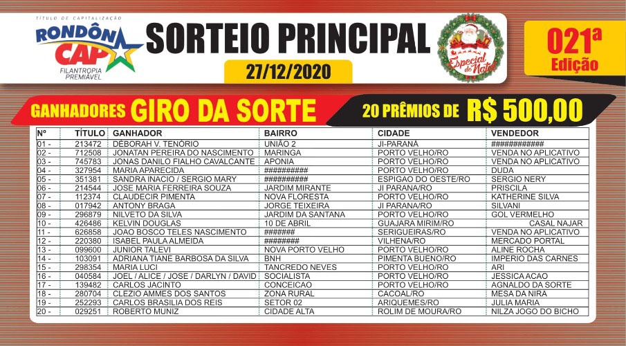 O Rondoncap especial de Natal levou a sorte a vários municípios de Rondônia, confira agora os sorteados ontem: