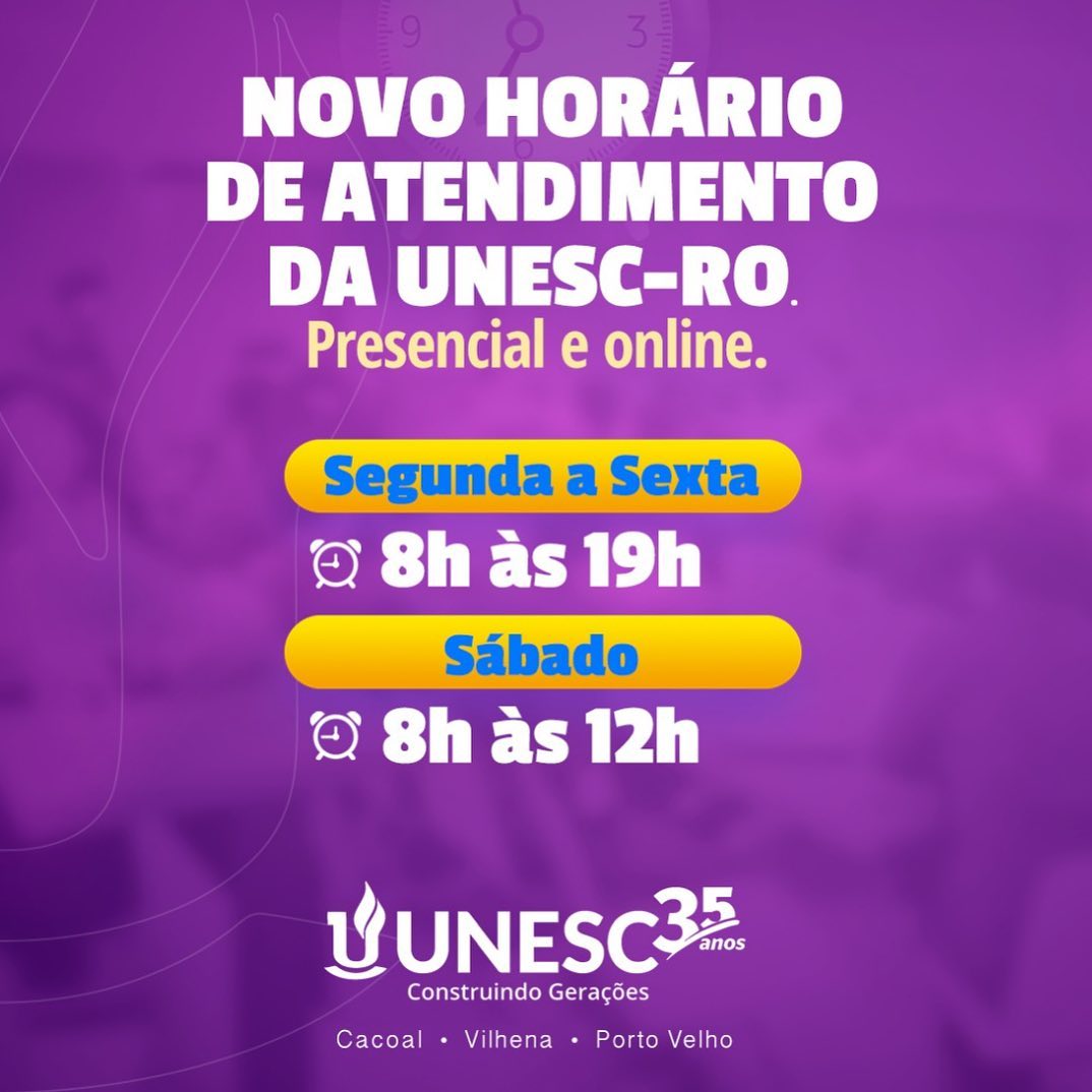 Além do atendimento online, as unidades da Unesc | Rondônia em Cacoal, Vilhena e Porto Velho ampliaram o horário voltado ao atendimento presencial, com o objetivo de evitar ao máximo qualquer aglomeração de pessoas na instituição. Desde o início da semana, o atendimento é feito nas unidades, no horário das 8h as 19h, de segunda a sexta-feira e também das 8h ao meio-dia.