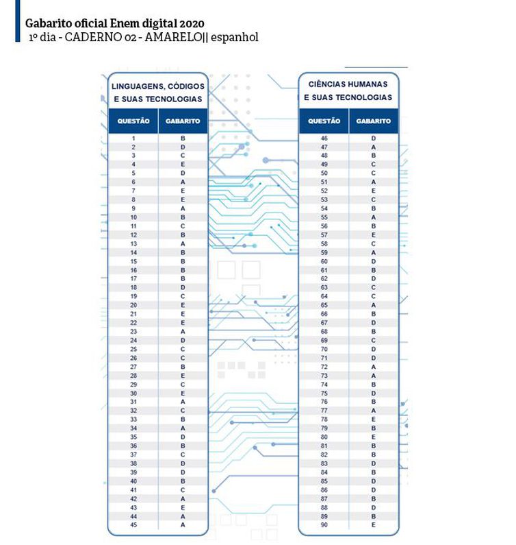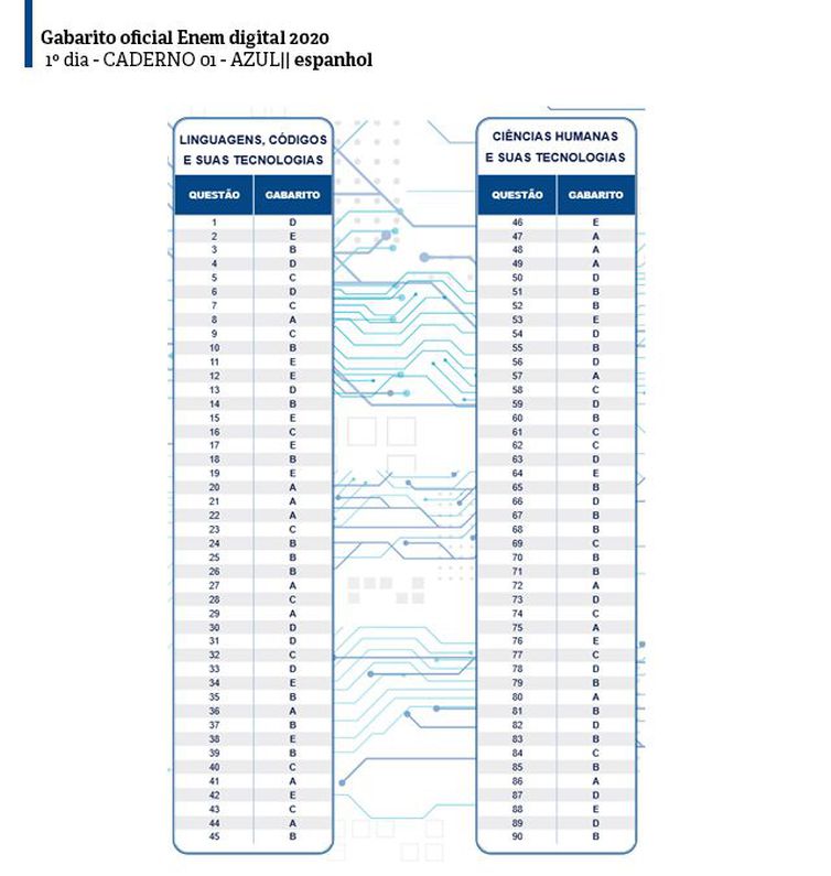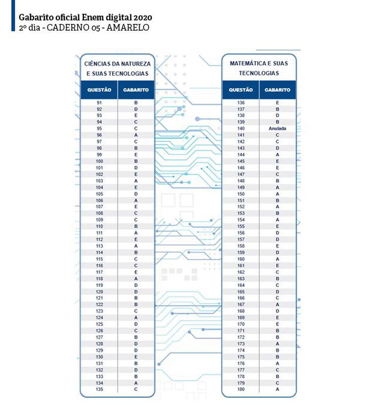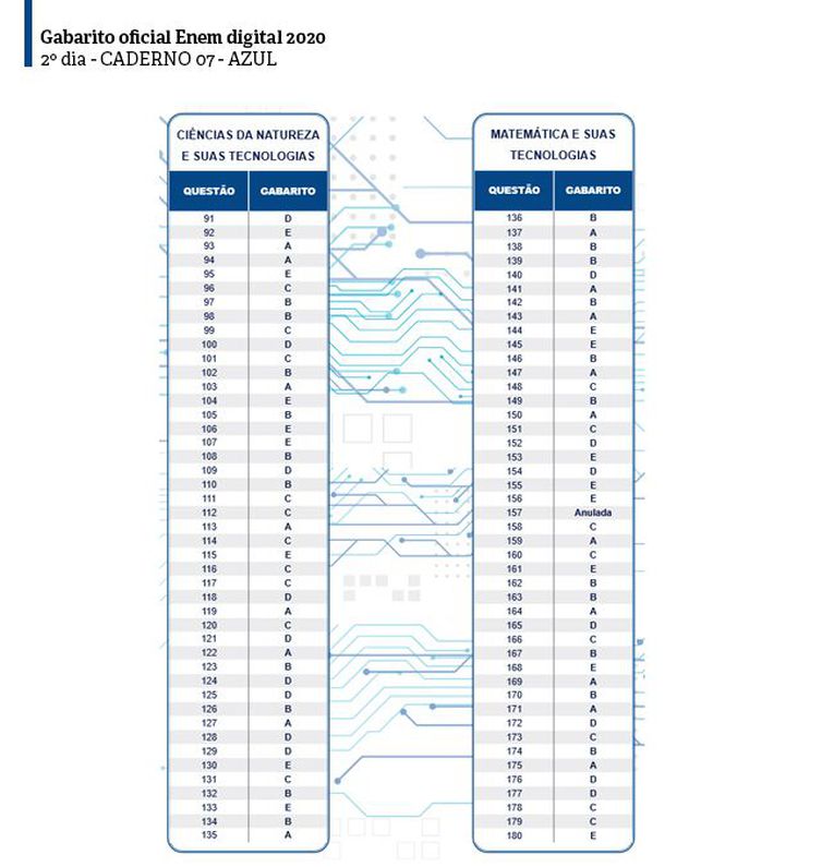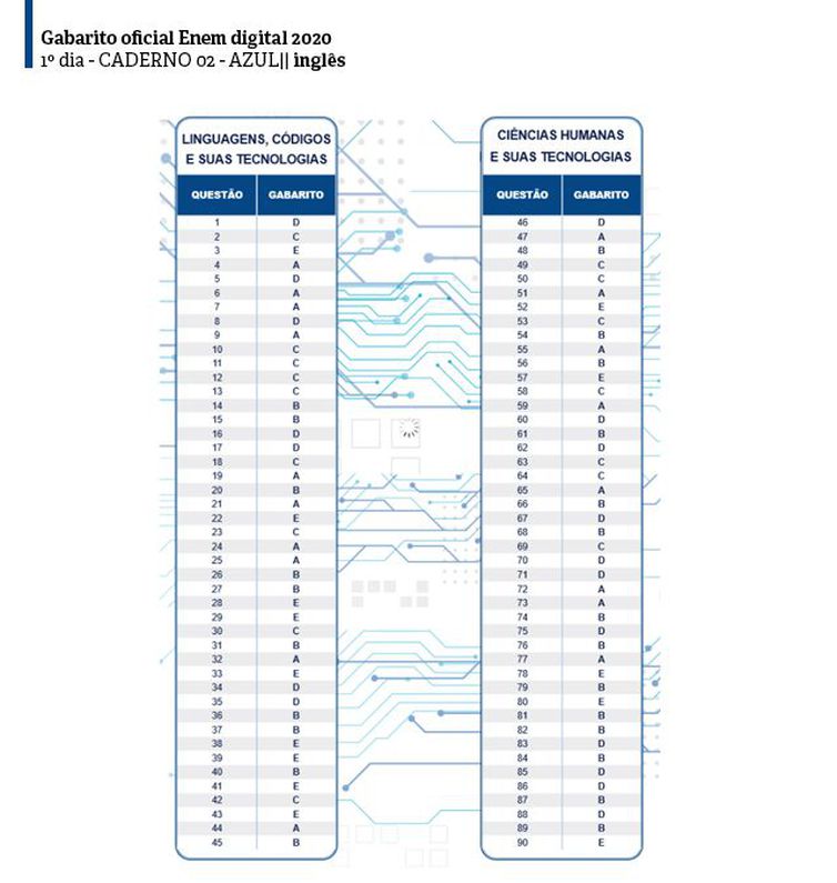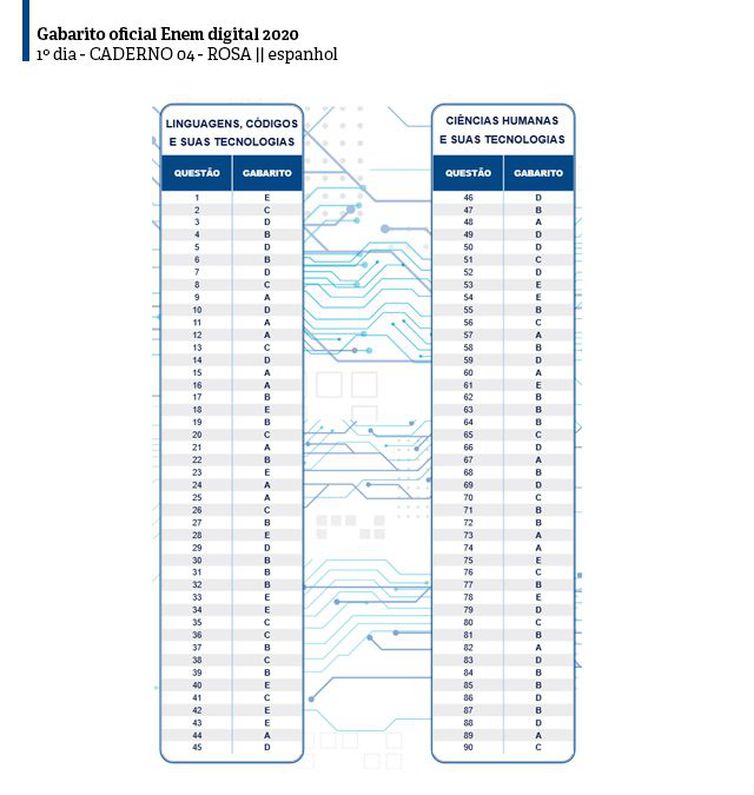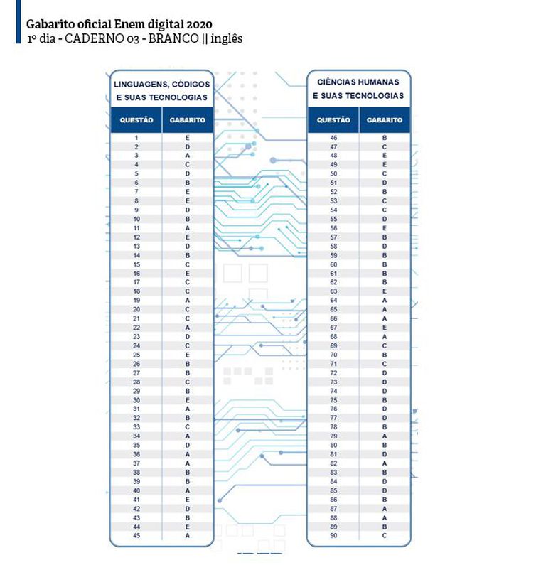 O Instituto Nacional de Estudos e Pesquisas Educacionais (Inep) publicou no fim da tarde de hoje (10) os gabaritos das questões objetivas do Exame Nacional do Ensino Médio (Enem) 2020, versão digital. Os gabaritos também podem ser conferidos no site do instituto.
