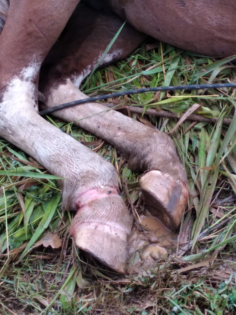 Um dos animais está com uma pata ferida e com tapurus, dificultando a locomoção dele